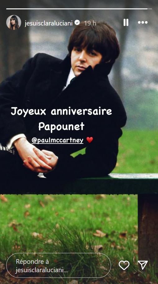 Car hier, c'était l'anniversaire de Paul McCartney, qui vient de fêter ses 83 ans. La chanteuse a décidé de rendre un bel hommage au chanteur, mais aussi à son papa, en story de son compte Instagram. Elle a posté une photo de Paul McCartney, le célèbre membre des Beatles, allongé sur un banc, avec en légende "Joyeux anniversaire papounet" accompagné d'un cœur. Evidemment, Clara Luciani n'est pas la fille de Paul McCartney, et on se doute qu'elle n'aurait échangé son papa contre rien au monde : c'est lui qui lui a donné le goût de la musique, et il était un grand fan des Beatles.