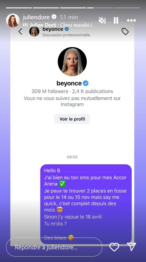 Evidemment, il y a peu de chances que Beyoncé finisse par répondre au message de Julien Doré, mais sait-on jamais ! C'est surtout une manière très subtile et assez drôle d'informer ses followers sur le fait que des dates ont été rajoutées à la fin de la tournée du chanteur, notamment, en effet, un concert supplémentaire à Bercy le 18 avril 2026. Si vous voulez la liste des dates de la tournée de notre Juju Doré, c'est par ici que ça se passe !