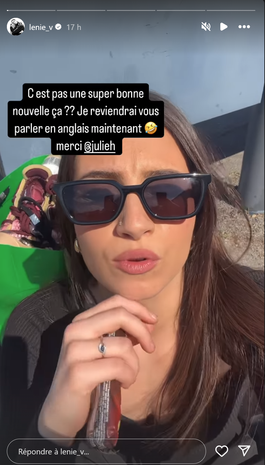 "J'ai un petit truc à vous raconter. Pour mon anniversaire, Julie [sa manager] m'a fait une surprise. Et cette surprise consiste à aller à Los Angeles pendant trois semaines pour apprendre l'anglais. Vous me connaissez très bien, je fais du yaourt en anglais chaque jour de ma vie. J'espère que vous êtes contents parce que moi je le suis très profondément, j'ai trop hâte d'aller à Los Angeles" - Lénie