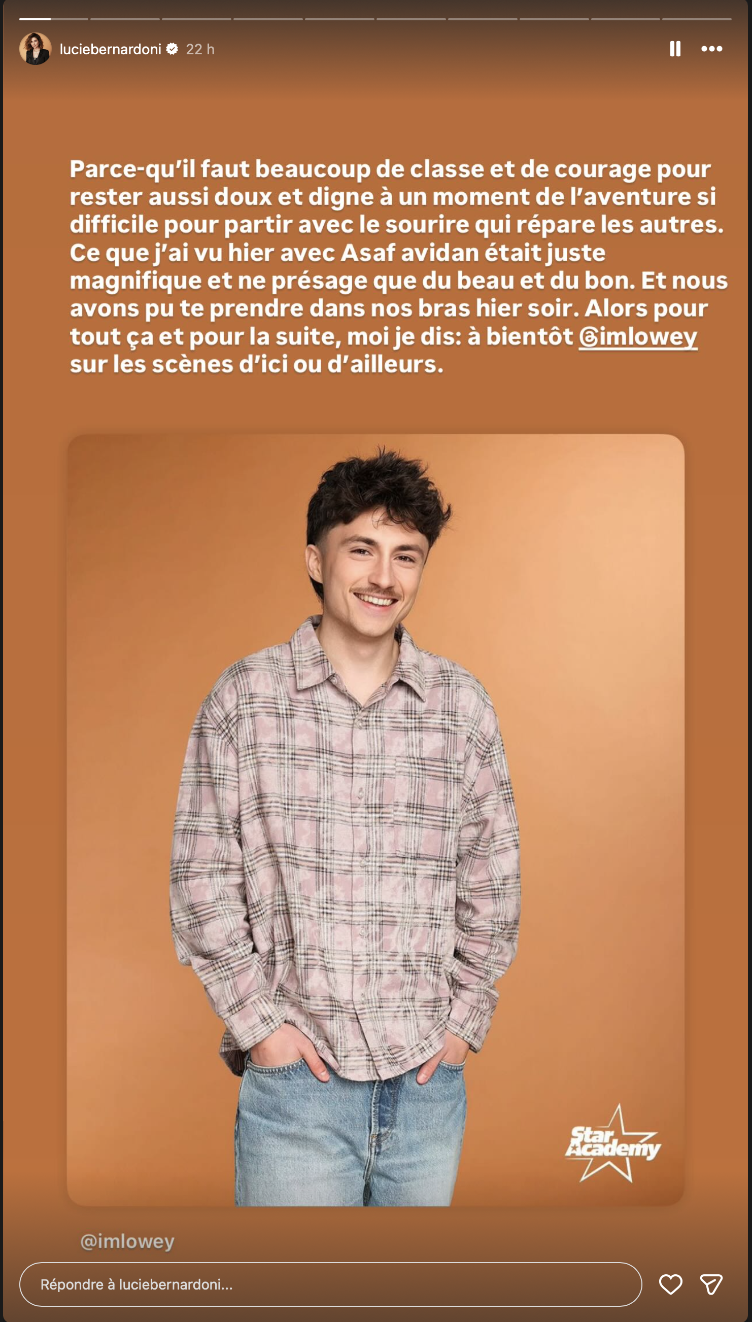Peu après son élimination, Léo a malgré tout trouvé la force et le fair-play d’adresser un message particulièrement touchant à ses désormais, anciens camarades : "A ceux qui sont dans le bus, je vous aime, je ne sais pas s'ils m'entendent. Je vous aime, vous allez tous tuer ça, j'ai trop hâte de vous voir". Des mots sincères, empreints de bienveillance, qui n’ont pas laissé indifférents, à commencer par Lucie Bernardoni, laquelle a tenu à saluer publiquement l’état d’esprit du chanteur en story Instagram :