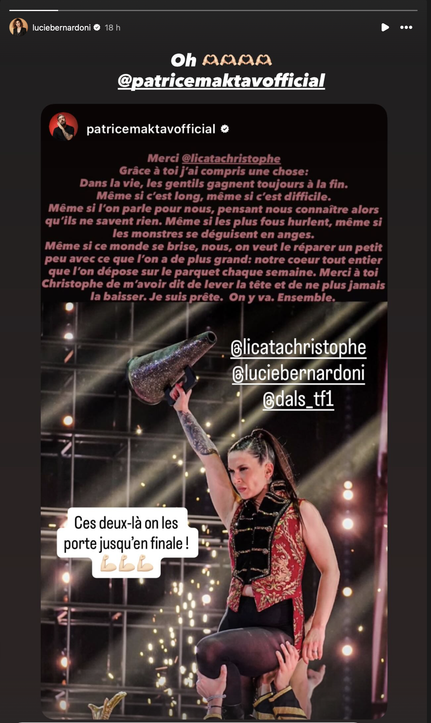 Une déclaration qui résonne d’autant plus que l’artiste traverse actuellement une période personnelle compliquée. Mais ce message n’a pas seulement touché son partenaire de danse. Il a également fait réagir Patrice Maktav, l'ex-mari de Lucie Bernardoni. Sur Instagram, ce dernier a repartagé la publication avec un commentaire témoignant d’un soutien sincère : "Ces deux-là on les porte jusqu'en finale !"