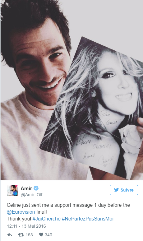 Céline Dion a représenté la Suisse à l’Eurovision en 1988 et a remporté le concours. A un jour de la finale de l’Eurovision 2016, la chanteuse a montré son soutien à …. Amir !