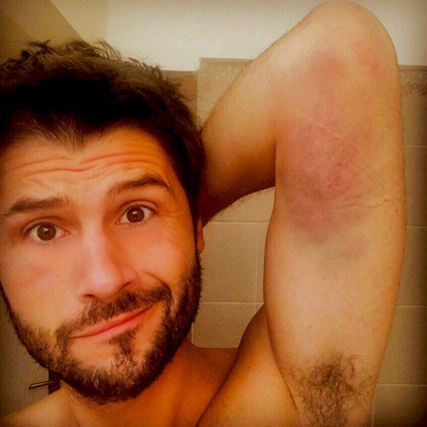 Il a posté une photo de son énorme hématome sous le coude, accompagné d'un petit commentaire : " Voici le joli bleu de mon entorse (chute minable dans le parking de TF1)."