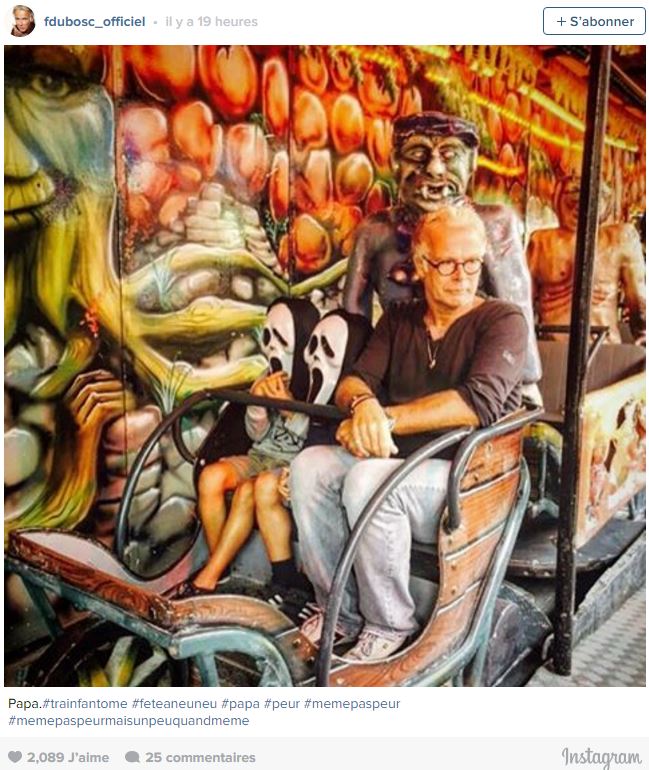 On y découvre Franck Dubosc assis avec ses fils prêts à faire un tour de train fantôme. Déguisés d’un masque du film « Scream », les jeunes garçons ont pu compter sur leur papa, qui quant à lui n’a pas l’air très rassuré.