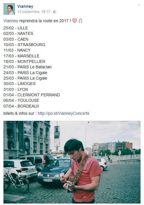 Et c'est sur son facebook qu'il l'a annoncé, le chanteur repartira sur les routes dès le mois de février 2017, pour 15 dates.