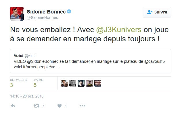 Sidonie Bonnec a conclu en disant qu’elle allait réfléchir. Cependant, l'animatrice a écrit sur les réseaux sociaux que c'était un jeu entre eux de se demander en mariage.