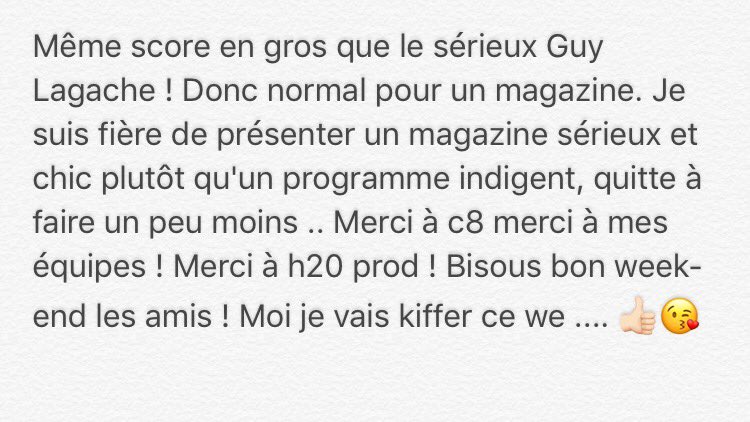 Mais la chroniqueuse de TPMP préfère voir ces audiences d'un autre oeil, qu'elle trouve "normales pour un magazine". Une réponse aux critiques qu'elle a décidé de publier sur Twitter. "Je suis fière de présenter un programme sérieux et chic plutôt qu'un programme indigent, quitte à faire un peu moins" a-t-elle tenu à préciser.
