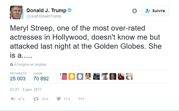 Une attaque à laquelle le futur président américain n'a pas manqué de régir sur son compte Twitter :" Meryl Streep, l'une des actrices les plus surévaluées de Hollywood, ne me connaît pas mais m'a attaqué la nuit dernière aux Golden Globes. C'est une..."