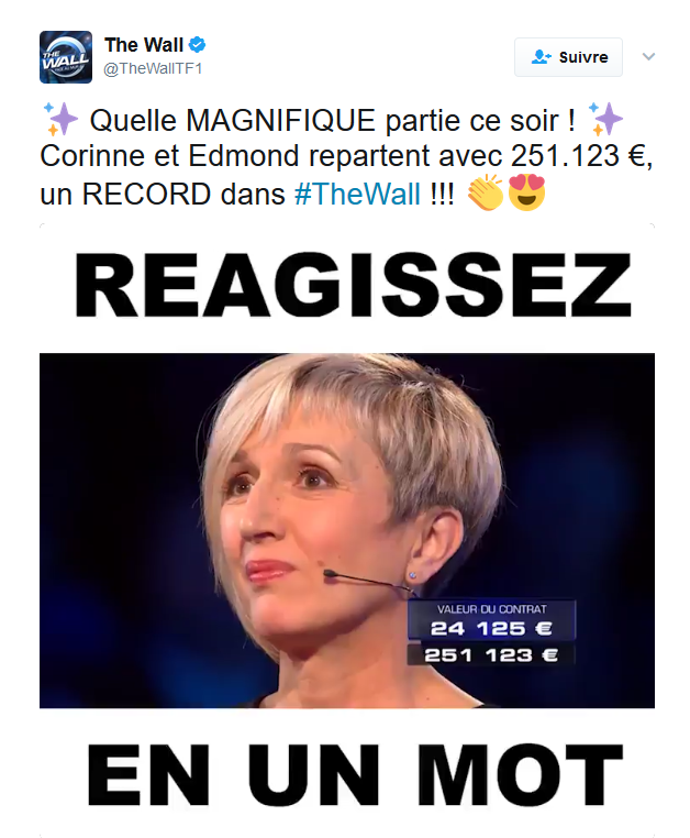 Hier, c’est un couple marié, Corinne et Edmond, respectivement coiffeuse et éboueur qui ont tenté de défier le mur ! Et pari réussi, ils ont remporté la plus grosse somme déjà gagnée dans le jeu, soit 251 123 euros (à partager avec un téléspectateur).