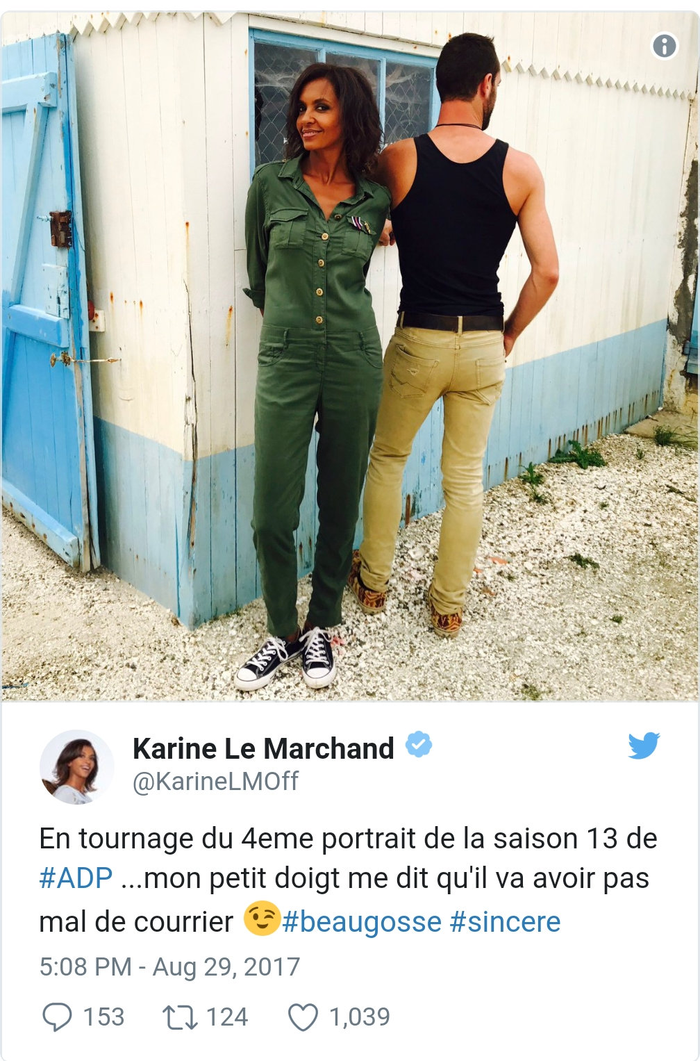 Alors que la saison 12 de L'amour est dans le pré passe actuellement et fait vibrer le cœur des téléspectateurs sur M6. Karine Le Marchand est déjà en train de tourner la saison 13. Après avoir presque dévoilé le visage d'un participant il y a quelques semaines, l'animatrice de 49 ans vient de publier un cliché du beau gosse de l'édition à venir sur son twitter.