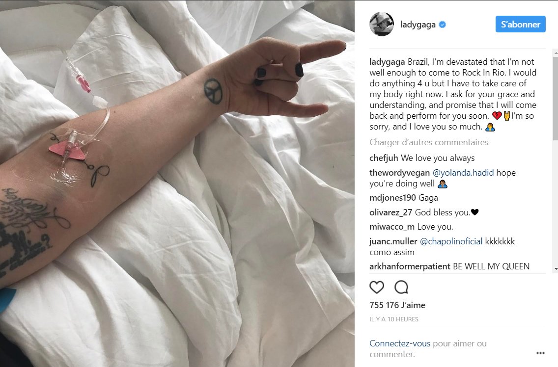La star s’est exprimée sur Twitter. « Brésil, je suis dévastée, mais je ne me sens pas assez bien pour venir à Rock in Rio. Je suis prête à tout faire pour vous mais je dois prendre soin de mon corps. » Elle a ensuite rajouté sur Instagram : « J'ai dû être hospitalisée (...) Je ressens de fortes douleurs. Je suis entre les mains des meilleurs docteurs. » Une photo de son bras sous perfusion accompagne le message.