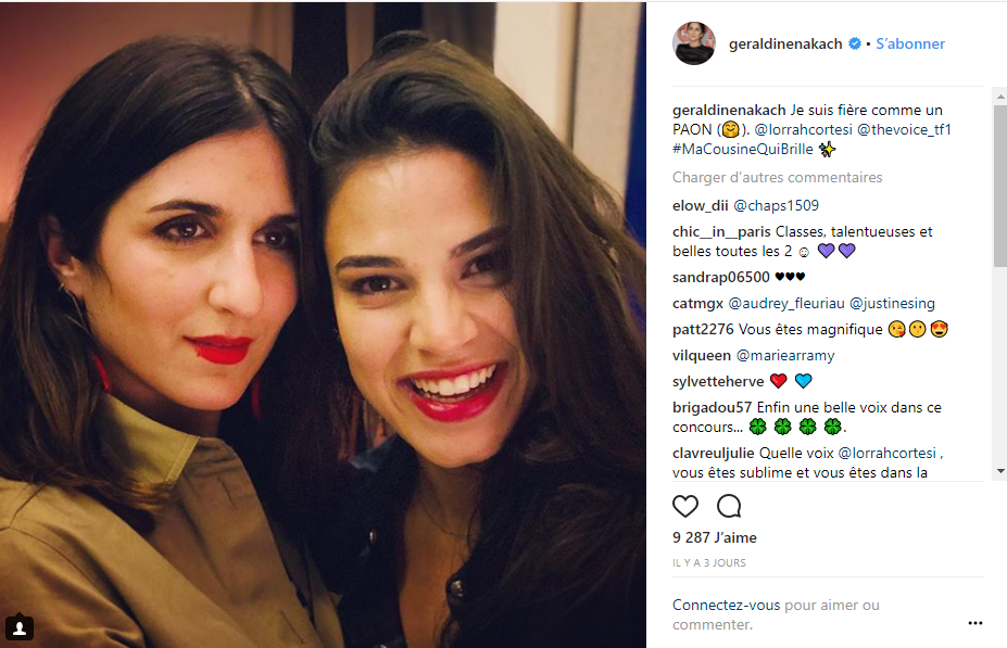 En effet, Lorrah Cortesi l’une des dernières candidates, n’a autre pour cousine que l’actrice… Geraldine Nakache ! Et la comédienne n’a pas manqué d’encourager sa cousine sur les réseaux sociaux : « Je suis fière comme un PAON ! » écrivait-elle sur Instagram, en légende d'une photo. Dans les commentaires, on peut lire un, "Elle va gagner. Crois-moi, je vois ces choses-là" signé par l’actrice Marina Fois.