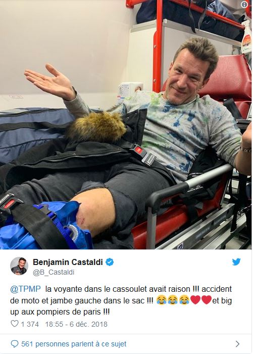 Sur twitter, il a tenu à rassurer ses fans avec une photo et une légende : « La voyante dans le cassoulet avait raison !!! Accident de moto et jambe gauche dans le sac !!! Et big up aux pompiers de Paris !!! ». Effectivement, histoire improbable, une voyante venue sur le plateau de TPMP le 9 novembre dernier avait prédit une mauvaise nouvelle pour le chroniqueur : « Je ne sais pas si tu fais du ski, ou du sport violent, mais de toutes façons y a jambe cassée ».