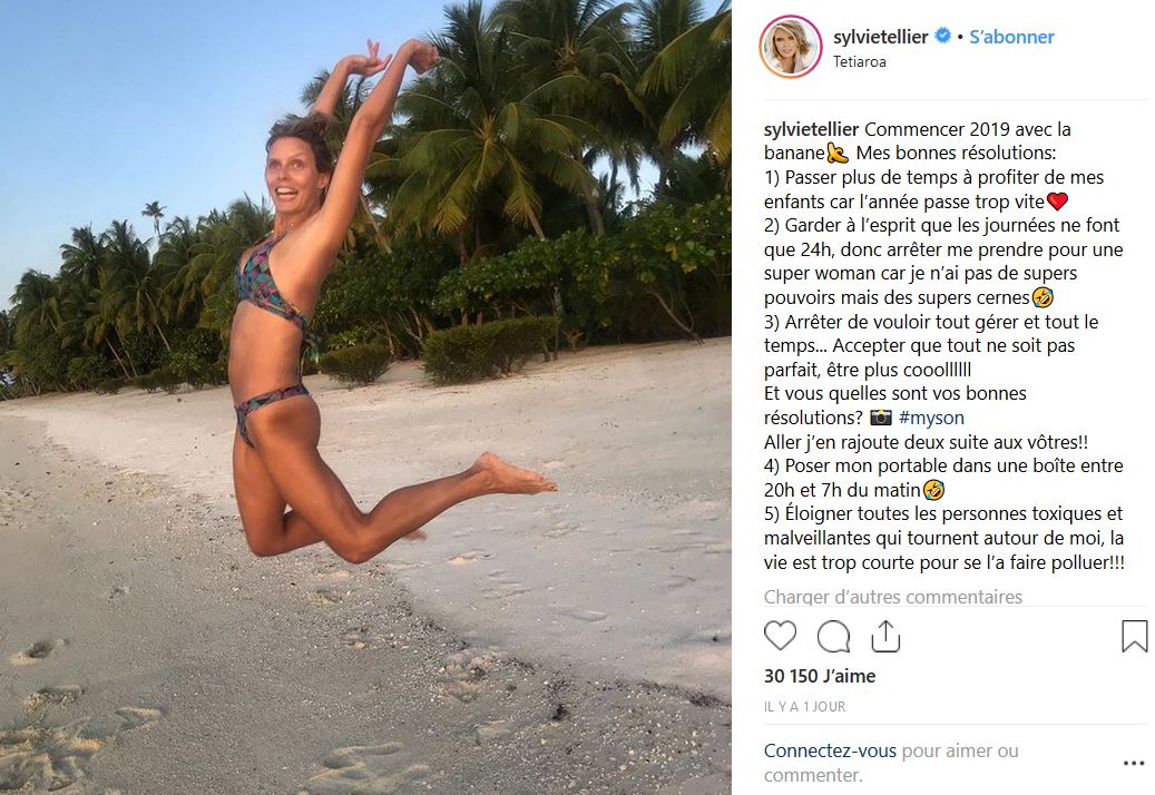 Sur l’une de ses photos on la voit sur la plage, en train de sauter joyeusement. En légende on peut lire : « Commencer 2019 avec la banane Mes bonnes résolutions : 1) Passer plus de temps à profiter de mes enfants car l’année passe trop vite / 2) Garder à l’esprit que les journées ne font que 24h, donc arrêter me prendre pour une super woman car je n’ai pas de supers pouvoirs mais des supers cernes / 3) Arrêter de vouloir tout gérer et tout le temps... Accepter que tout ne soit pas parfait, être plus cool. »