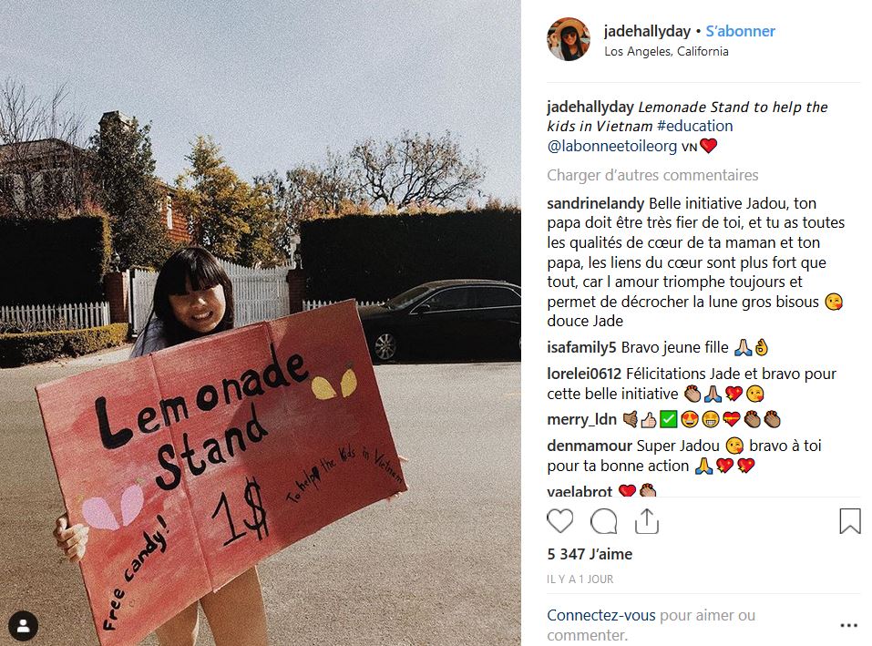 A la fin de l’année 2018, Laeticia, Jade et Joy Hallyday ont quitté les Etats-Unis pour se ressourcer dans le pays natal des deux jeunes filles : le Vietnam. Un voyage qui a profondément marqué l’ainée des deux sœurs, Jade Hallyday. Sur son compte Instagram, elle a posté une photo on la voit avec une pancarte où l’on peut lire : « Stand de limonade. Friandises gratuites. 1$ pour aider les enfants du Vietnam ».