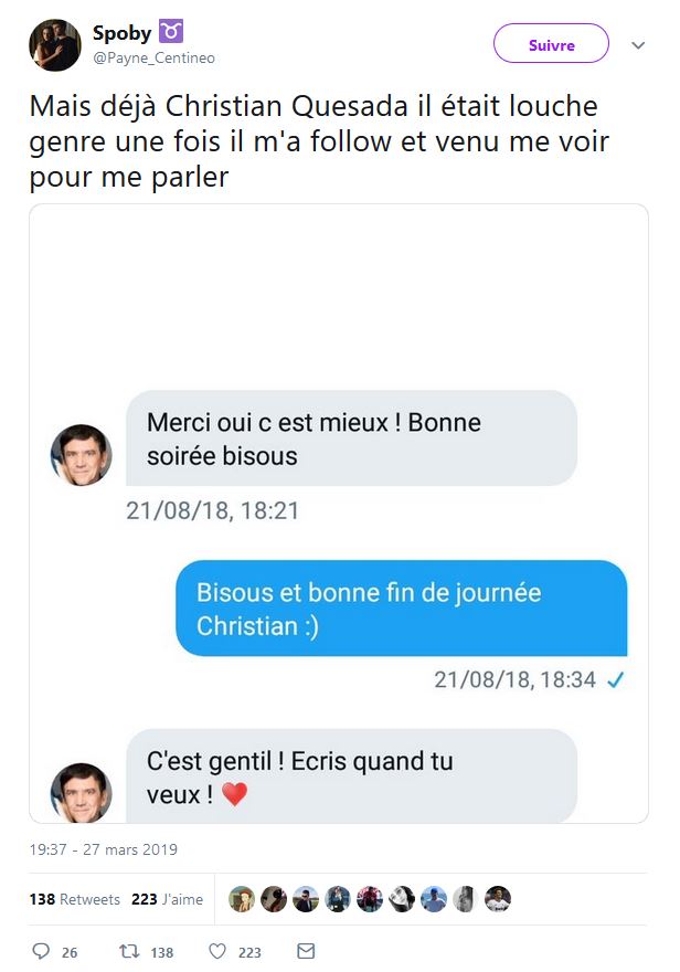 Mais voilà, des captures d’écrans ont été dévoilé sur le réseau social Twitter. On y découvre des échanges de messages avec des jeunes filles pour le moins déplacé. Certaines assurent que Christian Quesada aurait même envoyé des photos de son sexe.