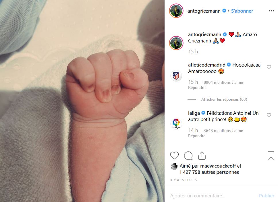 En 2016, le couple accueillait leur premier enfant, une petite fille du nom de Mia. Celle qui vient de fêter ses trois ans il y a quelques jours va donc partager ses parents avec un petit frère qui s’appelle « Amaro Griezmann ». Ce n’est pas une grande surprise pour ses fans puisqu’en octobre 2018, le joueur de football avait posté une vidéo très originale pour annoncer le sexe du bébé.