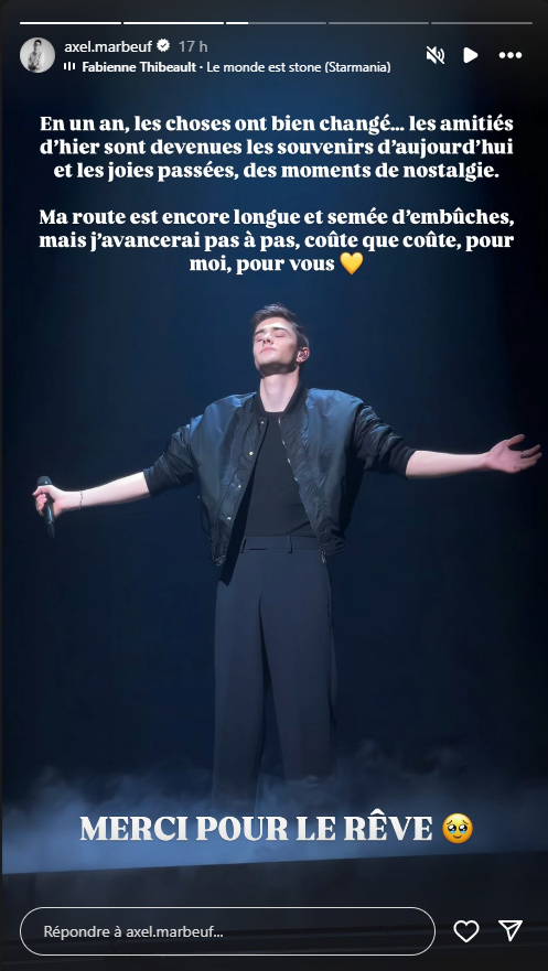 Après avoir dévoilé son premier single "Pour la première fois" et alors qu’un premier album est en préparation, le chanteur de 25 ans semble déterminé à tracer sa route. Mais dans sa dernière story Instagram, un certain coup de blues se fait sentir. Sur une image où il apparaît seul sur scène, les bras ouverts et les yeux fermés, Axel a accompagné la photo d’un message qui sème le doute :